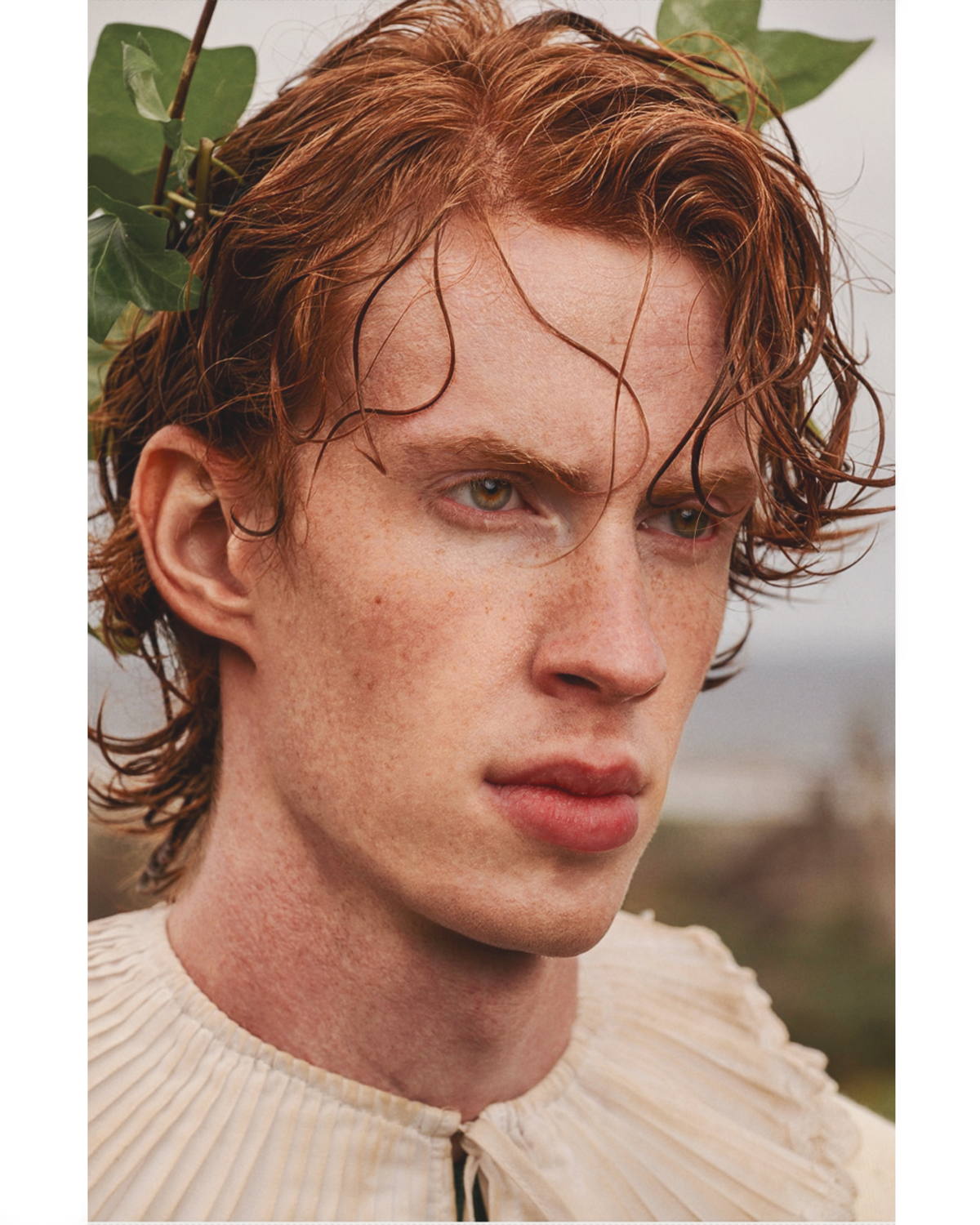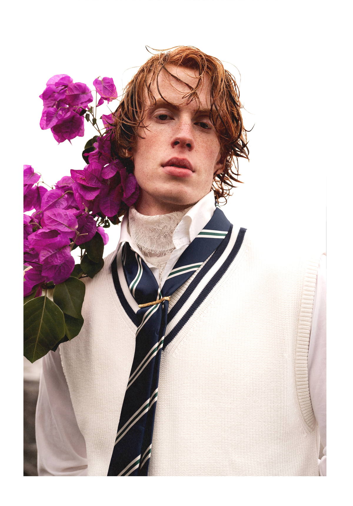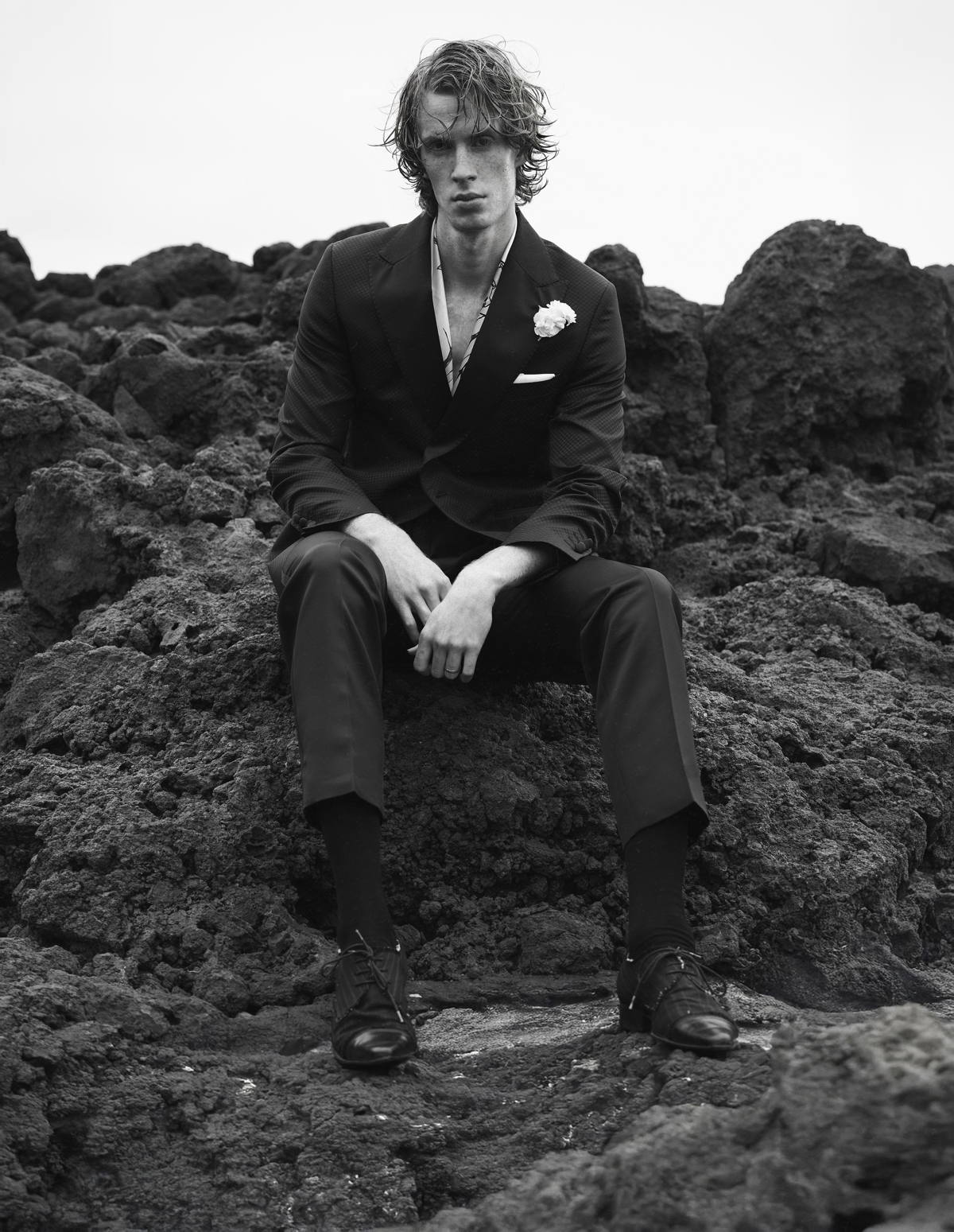 Gabardina y pantalones de JOSÉ ACOSTA, desarrollados a través de sastrería slow y producción local. Broches vintage, que abrazan la circularidad mediante la reutilización. Camisa de encaje de FILST, elaborada mediante un enfoque artesanal y de producción a pequeña escala. Camisa de algodón y corbata de GUCCI, parte de una estrategia centrada en la trazabilidad y la innovación circular. Zapatos de PAUL SMITH.
