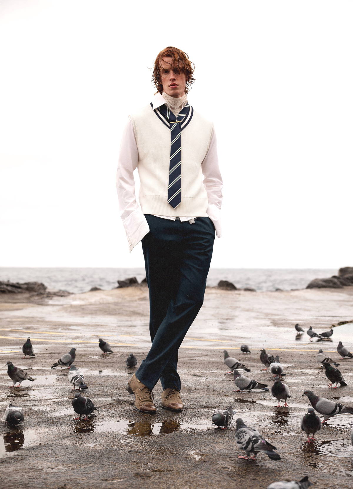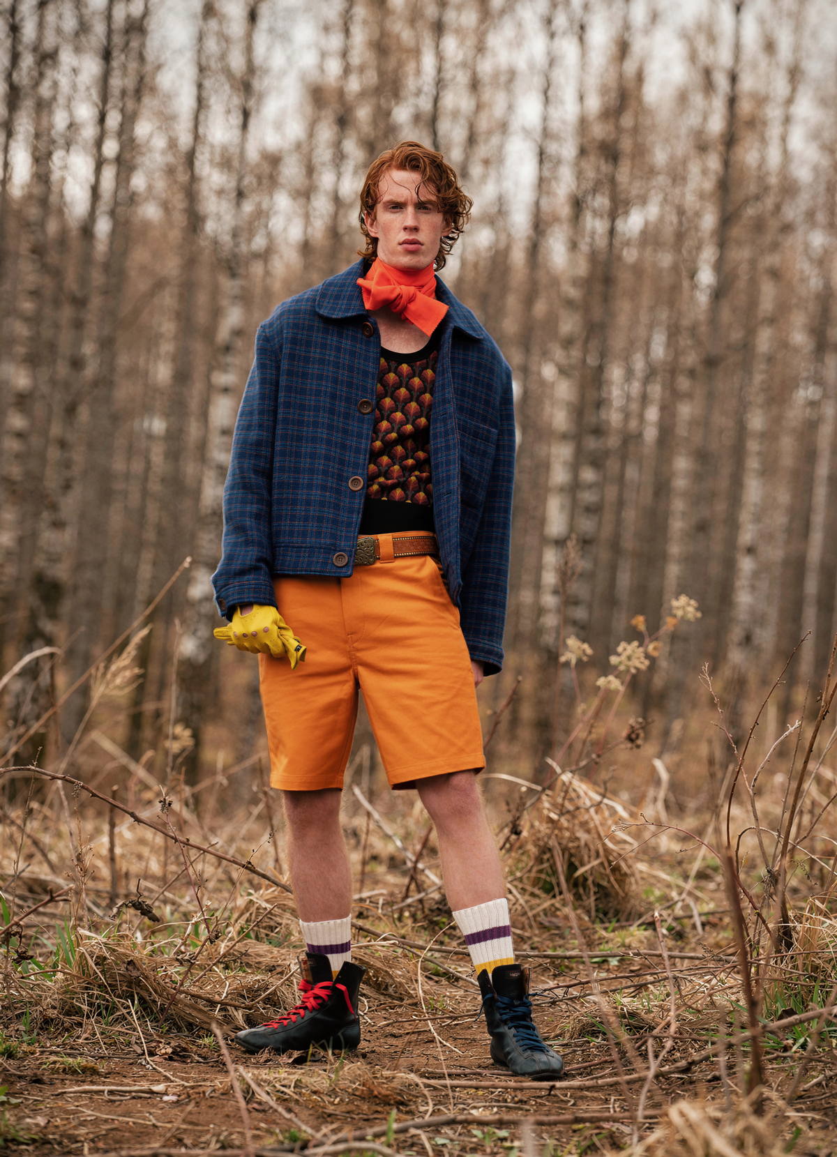 Chaqueta y chaleco de DRIES VAN NOTEN, que reflejan una filosofía de diseño atemporal y una reducción de la sobreproducción. Cuello de DIOR, arraigado en la artesanía y en prácticas de trazabilidad en evolución. Bermudas de DICKIES, diseñadas para la durabilidad y un uso prolongado. Botines de CAMPER, que combinan la artesanía mediterránea con iniciativas de ecodiseño. Calcetines de lana de EL GANSO, producidos en Europa con un creciente enfoque en materiales responsables.