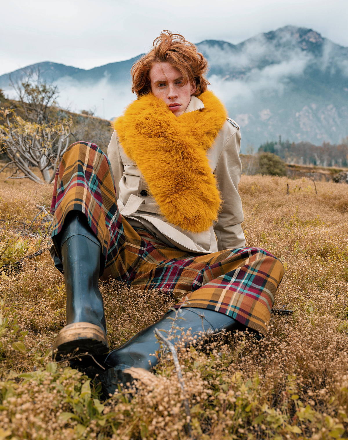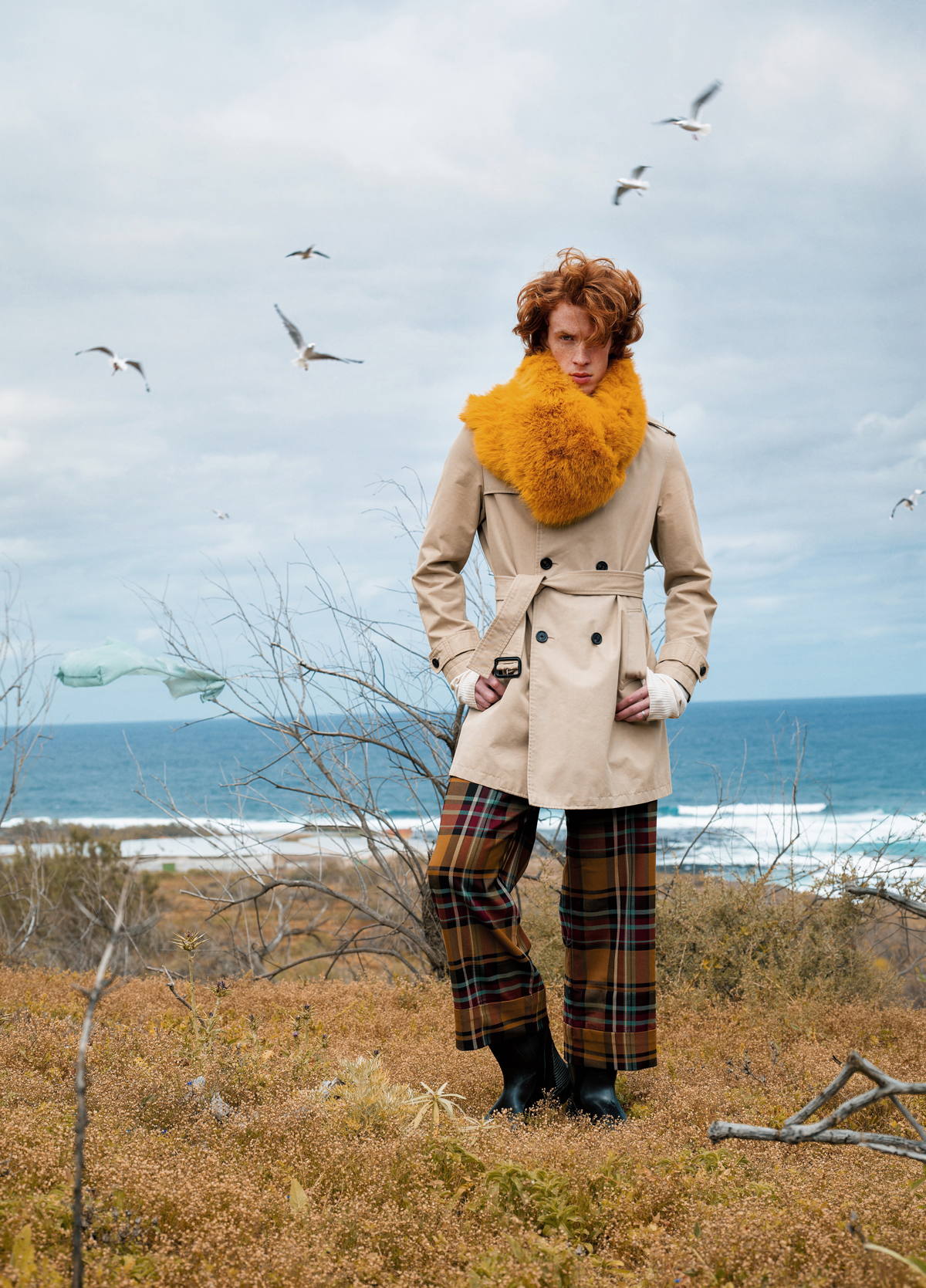 Gabardina de BURBERRY, comprometida con la reducción de carbono y el abastecimiento responsable. Bufanda de piel de SAINT LAURENT, que avanza en la trazabilidad y la responsabilidad de los materiales. Pantalones de tartán de VIVIENNE WESTWOOD, con raíces en el activismo y en la reducción de volúmenes de producción. Zapatos de PAUL SMITH, centrados en la artesanía y la longevidad.