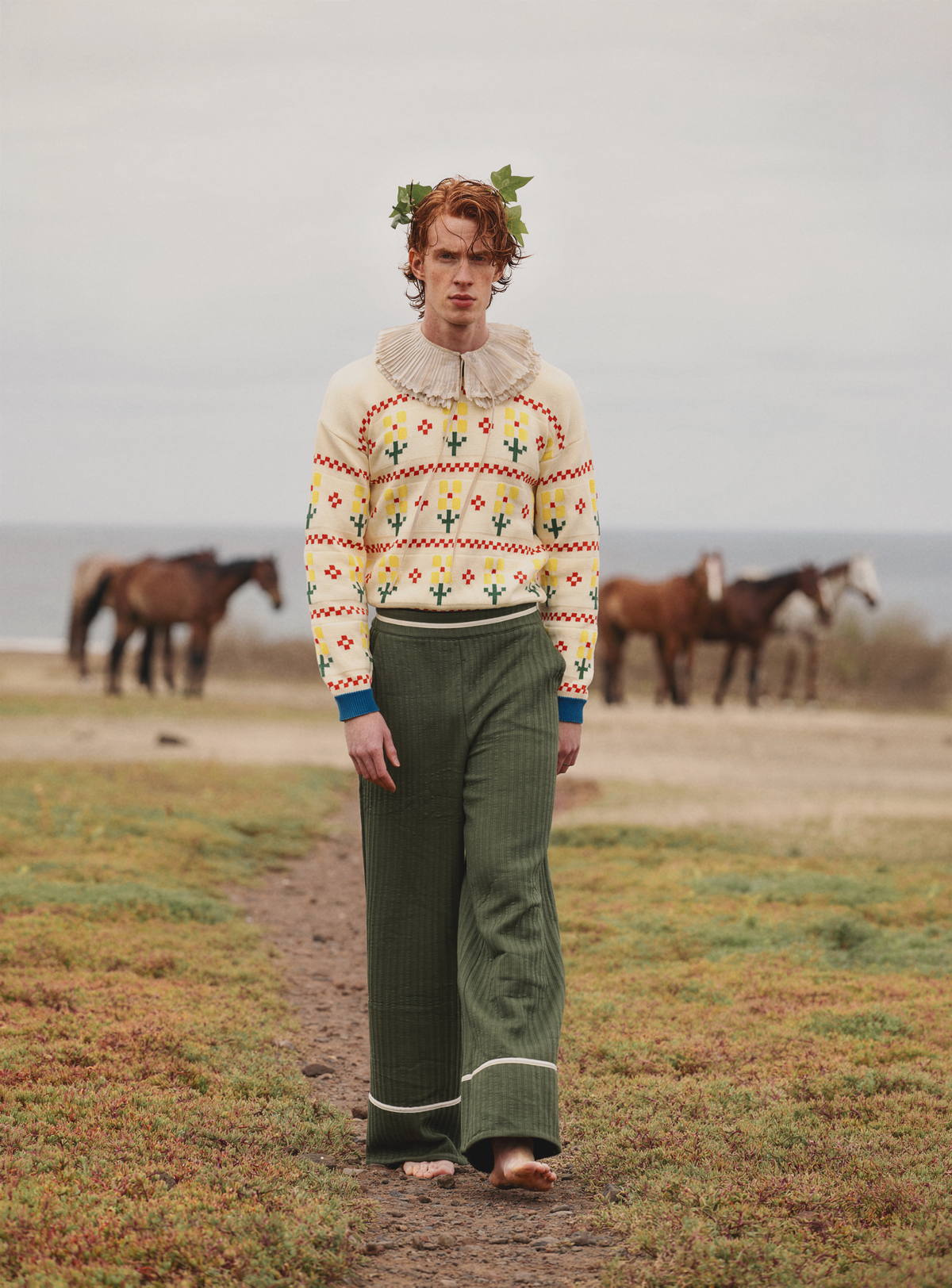 Suéter de VIVIENNE WESTWOOD, que combina abastecimiento responsable con una fuerte narrativa activista. Pantalones de lana de DRIES VAN NOTEN, desarrollados a través de un enfoque de producción consciente y una visión de diseño a largo plazo.